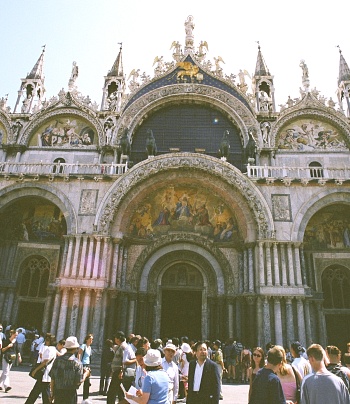 一方、左手奥の鐘楼は、最上部から海に浮かぶモザイクのような奇跡の街の眺めが楽しめる。L字型に曲がった奥の部分が、今や観光客に占拠されてしまったサンマルコ広場である。 |