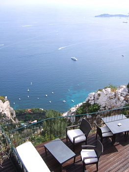 エズを訪れたバロコーヴッチが、金色の毛の山羊に導かれて進んで行くと、この建物に辿りついた、と伝えられている。かつて、このあたりの岩山では山羊が放牧されていた。実際、ホテル南面は山羊が遊ぶのにちょうど良い斜面になっている。南から逆光を浴びて金色に輝く、ヤギの神秘的な美しさに惹かれてついて行ったのだろう。