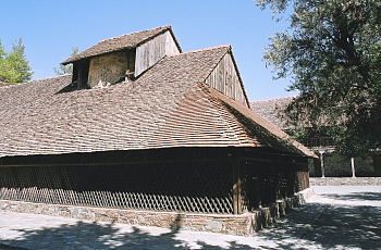 また建物にも特徴がある。冬は雪深いトロードス山中で積雪から守るため、ギリシア正教の十字プランの小聖堂をカバーするように、切妻型の大屋根が設置されている。一見倉庫のようにも見える建物の中に小聖堂があり、さらにその内側のドームや壁一面に素晴らしいフレスコ画が現れるという構造だ。